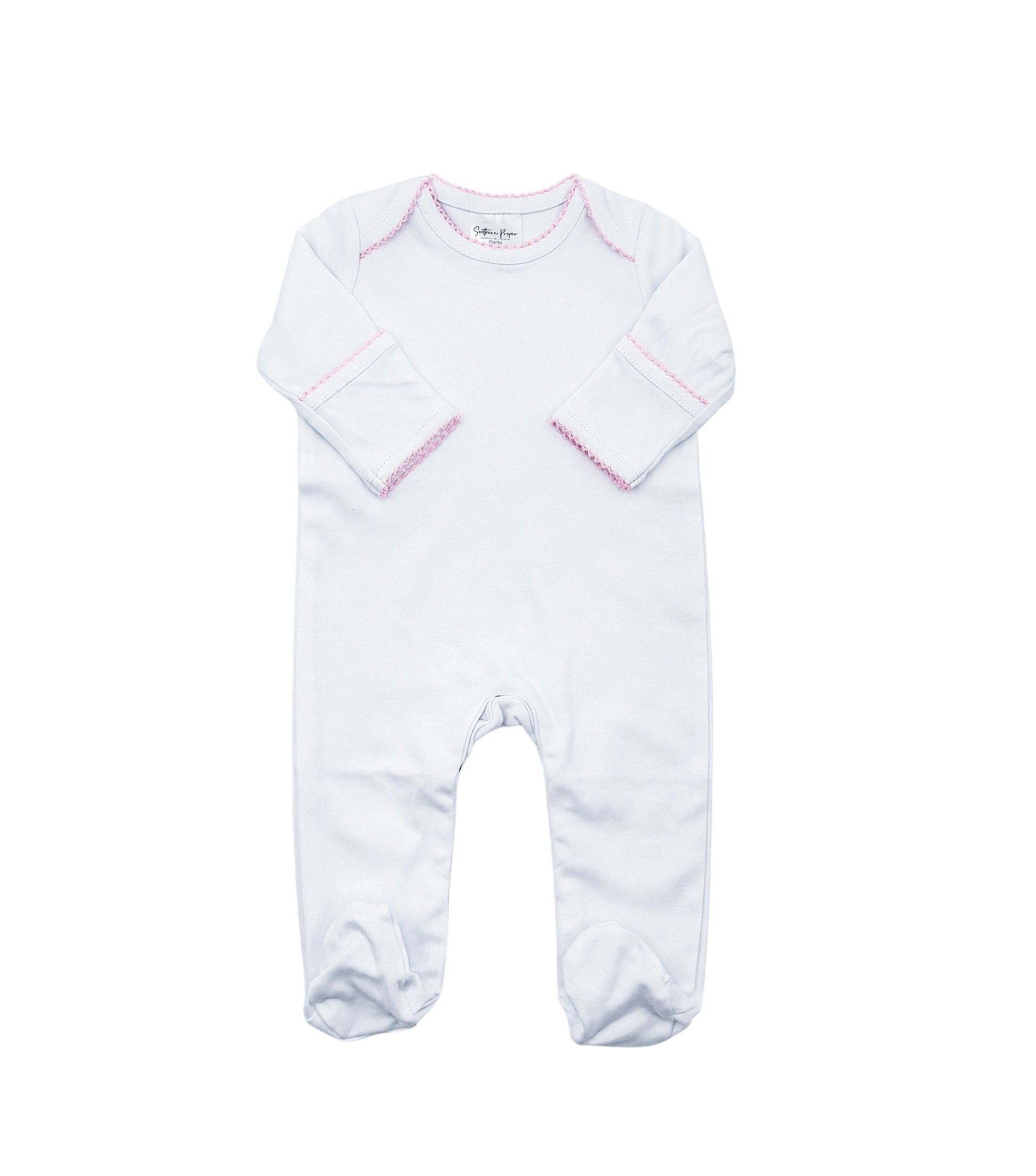 Wrap your little one in timeless Southern charm with our personalized footie. Made from ultra-soft white organic cotton, these cozy footie's feature delicate picot trim detailing. Hidden snap closures at bottom for easy diaper changes.
