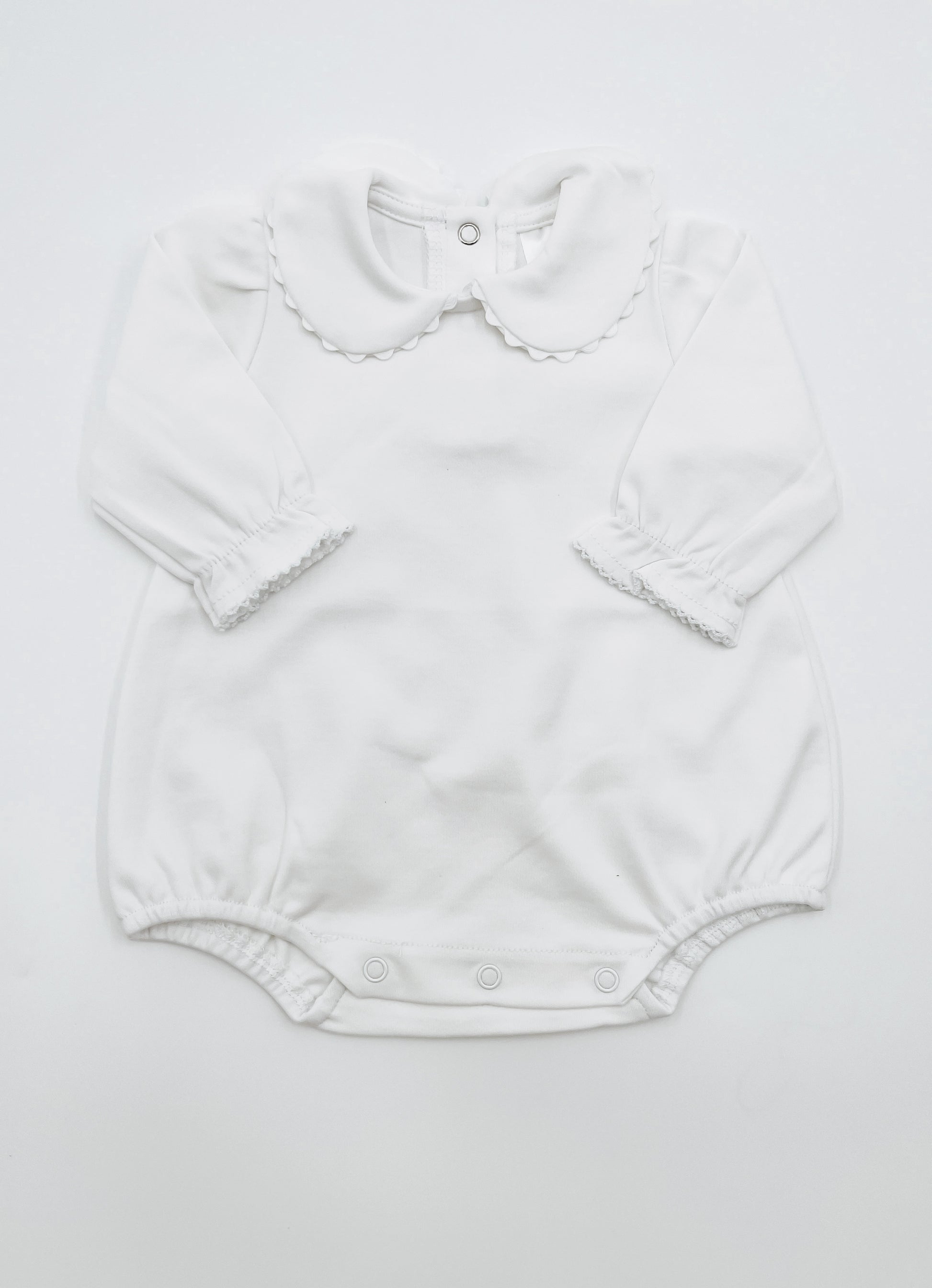 Our long sleeve bubbles are here! These are made from a cotton/spandex blend and just waiting for those little blessings! Sweet little details include a ricrac edge on the collar and picot trim on the sleeves.